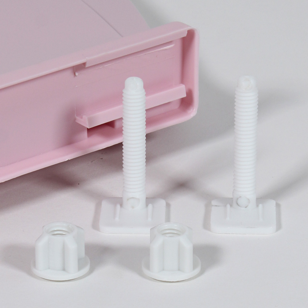 Instalación: Retire el asiento viejo con cuidado. Coloque los tornillos de las bisagras enroscando en los orificios del montaje de la taza. Desde la parte inferior, coloque la tuerca de plástico en el tornillo de la bisagra. Vuelva a apretar las tuercas después que el asiento haya estado en uso durante varias semanas.